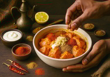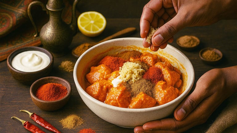 Joghurt, Zitronensaft, Garam Masala, Kurkuma, Chili, Kreuzkümmel, Salz und Ingwer-Knoblauch-Paste mischen. Das Hähnchen in Stücke schneiden und gründlich einmassieren.