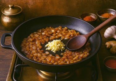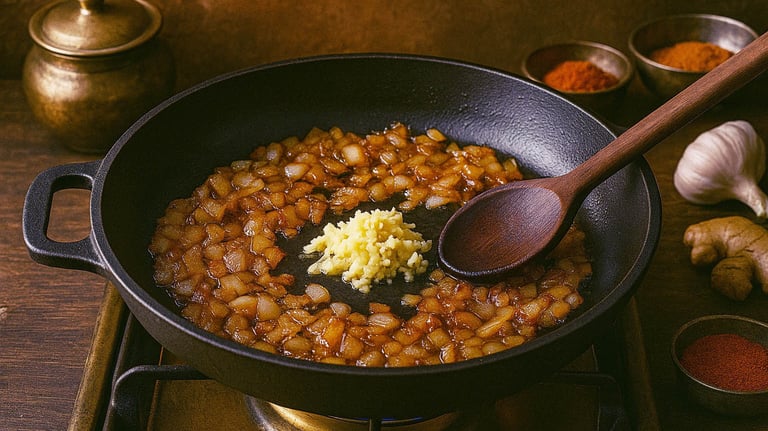Zwiebeln goldbraun braten (ca. 8–10 Minuten).