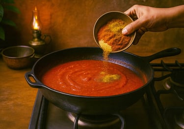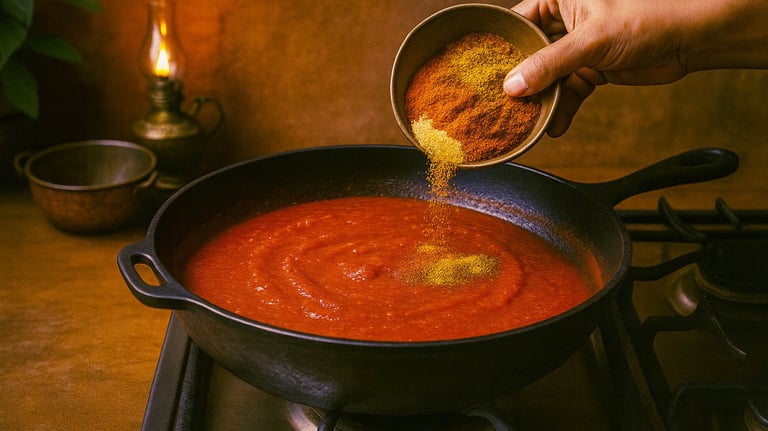 Tomatenpassata, Zucker, Garam Masala und Paprika dazugeben.