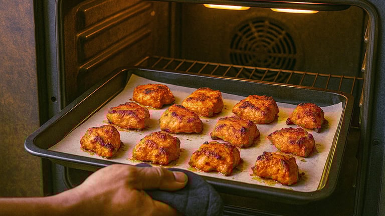 Hähnchenstücke auf ein Blech legen, etwas Abstand lassen.15–20 Minuten backen, bis sie leicht anbrennen („tandoori-style“).