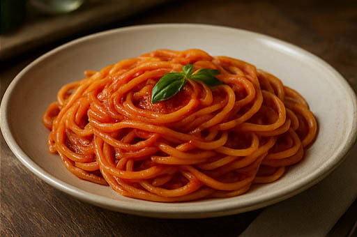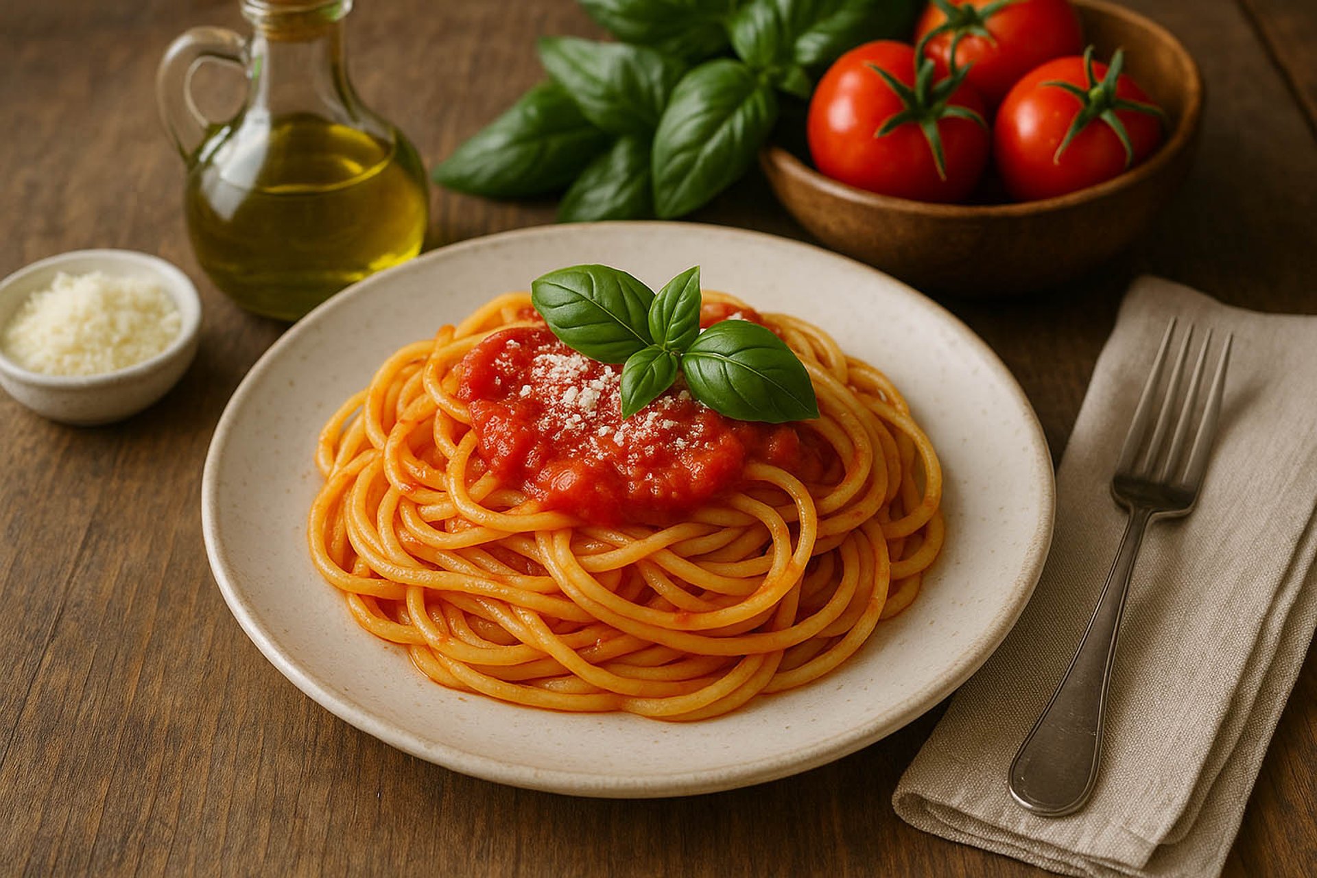 Optional: Einen Extra-Klecks Sauce und Parmesan darüber – wobei Italiener Spaghetti Napoli meist ohne Parmesan essen.