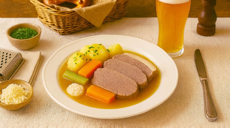 Tafelspitz ist ein Klassiker der bayerischen und österreichischen Wirtshausküche – schlicht, ehrlich und voller Wohlgefühl. Zart geschmortes Rindfleisch/Kalbfleisch, das stundenlang im aromatischen Sud mit Wurzelgemüse, Gewürzen und Geduld vor sich hin zieht, wird in feinen Scheiben serviert und von samtigen Kartoffeln, süßlicher Karotte, würzigem Sellerie und frisch geriebenem Meerrettich begleitet.